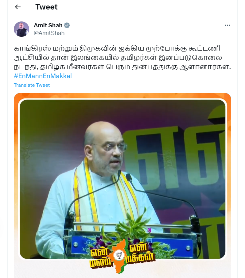 தமிழக பாரதிய ஜனதா கட்சியின் அமைப்பாளரான அண்ணாமலை “என் மண் என் மக்கள்” என்ற பெயரில் ஒரு பாதயாத்திரையை ஆரம்பித்திருக்கிறார். அதன் தொடக்க நிகழ்வு ராமேஸ்வரத்தில் இடம்பெற்றது.அதில் அமித்ஷா பேசினார்.பேச்சில் ஒருபகுதி பின்வருமாறு..”காங்கிரஸ் மற்றும் திமுகவின் ஐக்கிய முற்போக்கு கூட்டணியின் ஆட்சி காலத்தில்தான் இலங்கையில் தமிழர்கள் இனப்படுகொலை நடந்தது, தமிழக மீனவர்கள் மீனவர்கள் பெரும் துன்பத்துக்கு ஆளானார்கள்…”