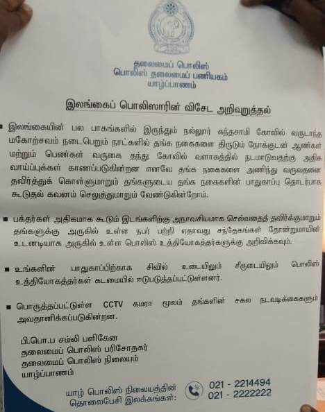 ஆலய சூழலில் திருடர்களின் நடமாட்டம் காணப்படுவதால், ஆலயத்திற்கு தங்க நகைகளை அணிந்து வருவதை தவிர்க்குமாறும், தாம் அணிந்துள்ள தங்க நகைகளில் கவனம் செலுத்துமாறும் பொலிஸார் பக்தர்களிடம் கோரியுள்ளனர்.