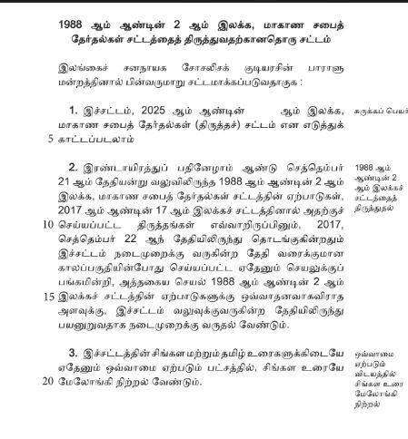 மாகாணசபை தேர்தல்களை நடத்துவதற்கு ஏதுவாக கெளர சாணக்கியன் இராசமாணிக்கம் அறிமுகப்படுத்தியுள்ள தனி நபர் சட்ட மூலம்.  மாகாணசபை தேர்தல்களை நடத்துவதற்கு ஏதுவாக என்னால் அறிமுகப்படுத்தப்பட்ட தனி நபர் சட்ட மூலம். வர்த்தமானியில் பிரசுரமாகியுள்ளது. எமது உரிமையை அடைவதில் எனது பங்கு எமது மக்களுக்காக என்றும் நிச்சயம் இருக்கும்.