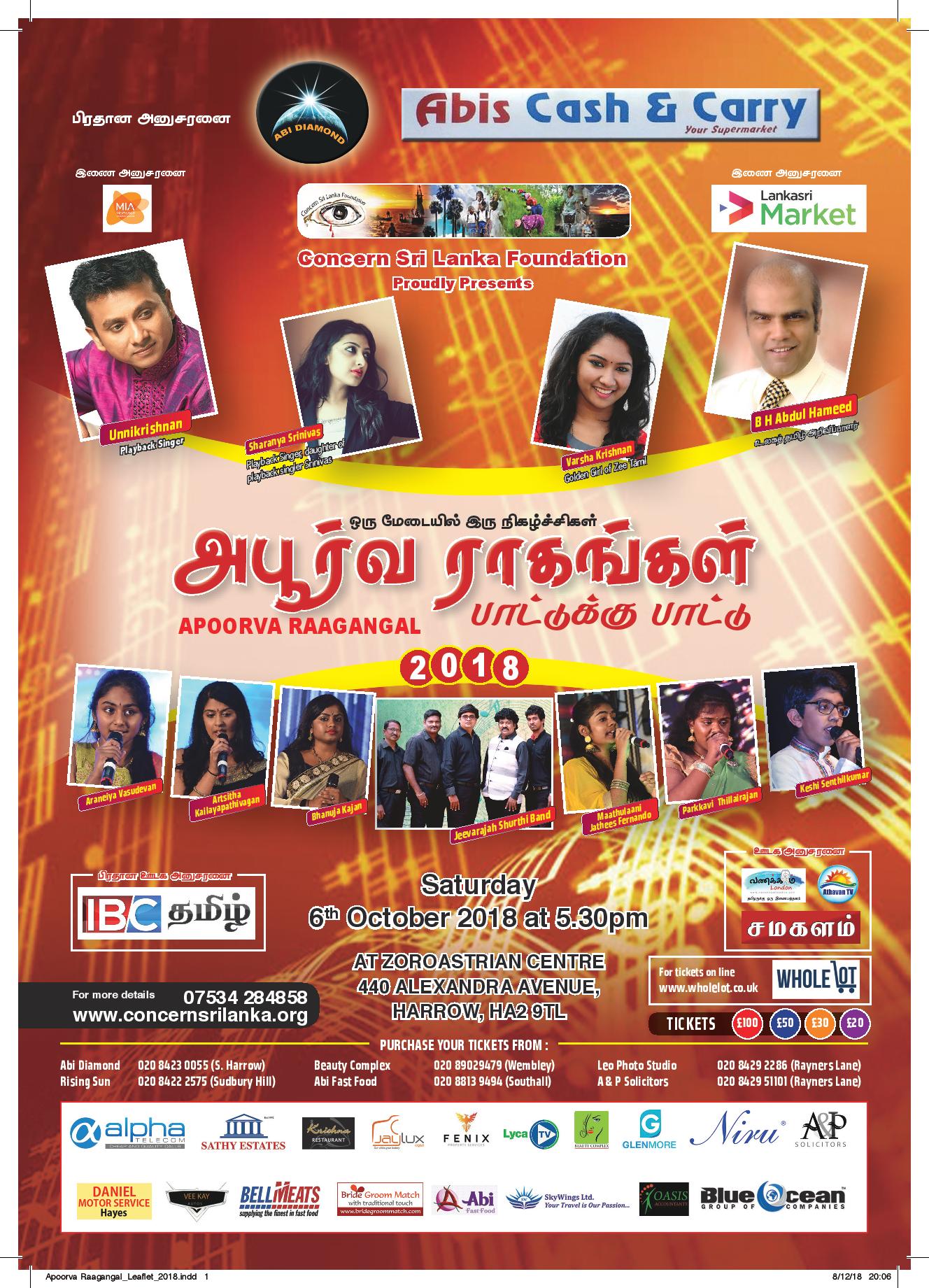 லண்டனில் உன்னிகிருஷ்ணன், அப்துல் ஹமீட் மற்றும் பலர் கலந்துகொள்ளும் ‘அபூர்வ ராகங்கள் 2018’
